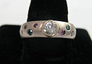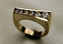 Channel setting is a method whereby stones are suspended between two bars or strips of metal, called channels. Often when setting small stones and the bars go in a line with the design it is called channel setting, and when the bars cross the lines of the design, it is called bar set. The idea is the same, though. The channel is some variation of a "U" shape, with two sides and a bottom. The sides are made just a bit narrower than the width of the stone or stones to be set, and then, using the same burs as in prong setting, a small notch, which is again called a bearing, is cut into each wall. The stone is put in place in those notches, and the metal on top is pushed down, tightening the stone in place. The proper way to set a channel is to cut a notch for each stone, but for cheaper production work sometimes a groove is cut along each channel. Also, since the metal can be very stiff and strong, this is a situation where a reciprocating hammer, which is like a jackhammer but jewelry sized, might be used to hammer down the metal, as it can be difficult to do by hand. Then, as always, the metal is filed down and finished, and the inner edge near the stones cleaned up and straightened as necessary. As with all jewelry, there can be many variations of channel work. At times the walls will be raised—sometimes a center stone will be set between two bars that rise high from the base ring—or the channel might just be cut directly into some surface, making the stones flush with the metal. It is still channel setting, though.