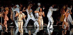 In October 1997, the group performed it as the ninth song of their first live concert at the Abdi Ipekçi Arena in Istanbul, Turkey. The performance was broadcast on Showtime in a pay-per-view concert special titled Spice Girls in Concert: Wild!.[53] However, the VHS and DVD release of the concert, Girl Power! Live in Istanbul, does not include the "Stop" performance.[54] In November 2007, the group performed together for the first time in nearly a decade at the 2007 Victoria's Secret Fashion Show, held in Los Angeles, California. The group dressed in military-themed outfits performed "Stop" miming to a backing track, in front of giant glittering lights that spelled out "Spice" in the background.[55] A taped performance of the group lyp-synching the song, while dressed in blue sailor outfits, aired on 17 November 2007 for the Children in Need 2007 marathon.[56] On 8 November 2010, Brown performed "Stop" with the second series' contestants of the Australian edition of The X Factor.[57]