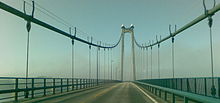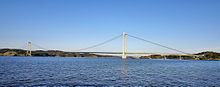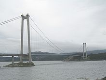 The Stord Bridge (Norwegian: Stordabrua) is a suspension bridge which crosses Digernessundet between the islands of Stord and Føyno in Stord Municipality in Vestland county, Norway. The bridge is 1,077 meters (3,533 ft) long, has a main span of 677 meters (2,221 ft) and a clearance below of 18 meters (59 ft). It carries two lanes of European Route E39 and a combined pedestrian and bicycle pathway. It is part of the Triangle Link, a fixed link which connects Stord to Bømlo, and both to the mainland. In 2010, the bridge had an average 5,021 vehicles per day. The bridge and the link was a toll road from the opening until 30 May 2013.