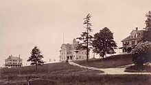 The Austin Academy once stood in the center of Strafford village. George Cate, a wealthy shoe manufacturer, visited the school at the request of its principal Alvin E. Thomas and was so impressed with the school that he left at his death $200,000 on the condition that his name be added to that of Mr. Austin. After his death, the hundred-acre farm of George Washington Foss was purchased and soon a beautiful new building, designed by well-known New Hampshire architect J. Edward Richardson, sat on the hill with the name on its facade, "Austin-Cate Academy - 1903". The property has been purchased by the state for a National Guard training center. The Foss farmhouse that was used as a dormitory burned in 1961 and was replaced with a one-story dormitory. The main building had burned in the early 1930s and was replaced with the brick building that is there now.[2]