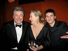 Greater success came later in the year when Streep starred in the drama Sophie's Choice (also 1982), portraying a Polish holocaust survivor caught in a love triangle between a young naïve writer (Peter MacNicol) and a Jewish intellectual (Kevin Kline). Streep's emotional dramatic performance and her apparent mastery of a Polish accent drew praise.[70][71] William Styron wrote the novel with Ursula Andress in mind for the role of Sophie, but Streep was determined to get the role.[72] Streep filmed the "choice" scene in one take and refused to do it again, finding it extremely painful and emotionally exhausting.[73] The scene in which Streep is ordered by an SS guard at Auschwitz to choose which one of her two children would be gassed and which would proceed to the labor camp, is her most famous scene, according to Emma Brockes of The Guardian who wrote in 2006: "It's classic Streep, the kind of scene that makes your scalp tighten, but defter in a way is her handling of smaller, harder-to-grasp emotions".[19] Among several acting awards, Streep won the Academy Award for Best Actress for her performance,[74] and her characterization was voted the third greatest movie performance of all time by Premiere magazine.[75] Roger Ebert said of her delivery, "Streep plays the Brooklyn scenes with an enchanting Polish-American accent (she has the first accent I've ever wanted to hug), and she plays the flashbacks in subtitled German and Polish. There is hardly an emotion that Streep doesn't touch in this movie, and yet we're never aware of her straining. This is one of the most astonishing and yet one of the most unaffected and natural performances I can imagine."[76] Pauline Kael on the contrary called the film an "infuriatingly bad movie" and thought that Streep "decorporealizes" herself, which she believed explained why her movie heroines "don't seem to be full characters, and why there are no incidental joys to be had from watching her".[77]