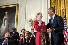 Streep was awarded the AFI Life Achievement Award in 2004, the Gala Tribute from the Film Society of Lincoln Center in 2008, and the Kennedy Center Honor in 2011 for her contribution to American culture through performing arts. President Barack Obama awarded her the 2010 National Medal of Arts and in 2014 the Presidential Medal of Freedom.[6][7] In 2003, the government of France made her a Commander of the Order of Arts and Letters.[8] In 2017, Streep was awarded the Golden Globe Cecil B. DeMille Award.[9]