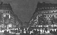 In Paris, public street lighting was first installed on a covered shopping street, the Passage des Panoramas, in 1817, private interior gas lighting having been previously demonstrated in a house on the rue Saint-Dominique seventeen years prior. The first gas lamps on the main streets of Paris appeared in January 1829 on the place du Carrousel and the rue de Rivoli, then on the rue de la Paix, place Vendôme, and rue de Castiglione. By 1857, the Grands Boulevards were all lit with gas; a Parisian writer enthused in August 1857: "That which most enchants the Parisians is the new lighting by gas of the boulevards...From the church of the Madeleine all the way to rue Montmartre, these two rows of lamps, shining with a clarity white and pure, have a marvelous effect." The gaslights installed on the boulevards and city monuments in the 19th century gave the city the nickname "The City of Light." [15]