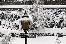 The first street to be lit by an incandescent lightbulb was Mosley Street, in Newcastle upon Tyne. The street was lit for one night by Joseph Swan's incandescent lamp on 3 February 1879.[20][21] Consequently, Newcastle has the first city street in the world to be lit by electric lighting.[22] The first city in the United States to successfully demonstrate electric lighting was Cleveland, Ohio with 12 electric lights around the Public Square road system on 29 April 1879.[23][24] Wabash, Indiana lit 4 Brush arc lamps with 3,000 candlepower each, suspended over their courthouse on 2 February 1880, making the town square "as light as midday".[25]