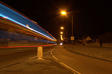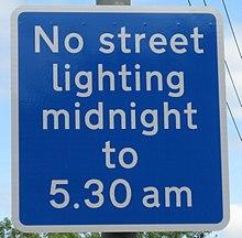 As of 2017, globally 70% of all electricity was generated by burning fossil fuels,[64] a source of air pollution and greenhouse gases, and also globally there are approximately 300 million street lights using that electricity.[65] Cities are exploring more efficient energy use, reducing street light power consumption by dimming lights during off-peak hours and switching to high-efficiency LED lamps.[66] Many councils are using a part-night lighting scheme to turn off lighting at quieter times of night. This is typically midnight to 5:30 AM, as seen by the sign on the right. There have, however, been questions about the impact on crime rates. Typical collector road lighting in New York State costs $6,400/mile/year for high pressure sodium at 8.5 kW/mile or $4,000 for light-emitting diode luminaires at 5.4 kW/mile.[67] Improvements can be made by optimising directionality and shape, however. Transitioning to wide angle lights enabled the doubling of distance between street lights in Flanders from 45 m to 90 m, cutting annual street lighting electricity expenditures to €9 million for the 2150 km long network that was retrofitted, corresponding to ca. €4186/km.[68]
