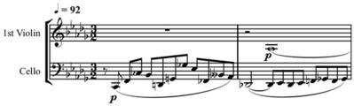 The piece contains twelve-tone elements, such as the opening in the cello:
