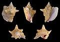 Five views of a shell of Lobatus gigas, a species in the family Strombidae Struthiolaria papulosa, a species in the family Struthiolariidae