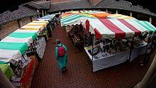 In addition to the farmers' market there is a smaller market held (Fri & Sat) in The Shambles, an area adjacent to the steep High Street. John Wesley preached from a butcher's block in The Shambles on 26 June 1742.[57] opposite one of the oldest existing buildings in Stroud, the Old Town Hall. Originally called the Market-house, this was built in 1594[58] and is still in occasional use today. Hinged trestles can still be seen along the Shambles, with cut marks, previously used by butchers probably from before WW2.