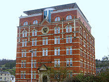Stroud is known for its involvement in the Industrial Revolution.[3] It was a cloth town: woollen mills were powered by the small rivers which flow through the five valleys, and supplied from Cotswold sheep which grazed on the hills above. Particularly noteworthy was the production of military uniforms in the colour Stroudwater Scarlet.[4][5] Stroud became known for its production of broadcloth, which was widely known as "Stroud cloth" and traded around the world.[6] The area became home to a sizable Huguenot community in the 17th century, fleeing persecution in Catholic France,[7] followed by a significant Jewish presence in the 19th century, linked to the tailoring and cloth industries.[8]