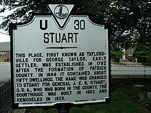 The Town of Stuart was first incorporated as Taylorsville, Virginia, in 1792, in honor of early settler George Taylor. Stuart has been the county seat of Patrick County since 1791, when the county was organized from territory of Henry County, Virginia. The Patrick County Courthouse was built in the center of the town. What is now designated as the Stuart Uptown Historic District encompasses the historic core of the county seat. It includes government, financial, religious, and commercial buildings dating from the mid-nineteenth to the mid-twentieth centuries.