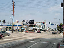 The studio zone, also known as the thirty-mile zone (TMZ), is an area defined by a 30-mile (48 km) radius of "Hollywood" used by the American entertainment industry to determine employee benefits for filmwork done within it. Its center has traditionally been regarded as the southwest corner of West Beverly Boulevard and North La Cienega Boulevard in Los Angeles, California. The boundaries of the 30-mile radius includes almost all of the southern half of Los Angeles County, as well as parts of eastern Ventura County and northwestern Orange County.