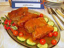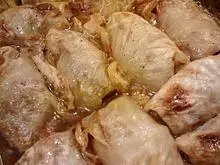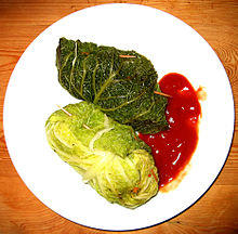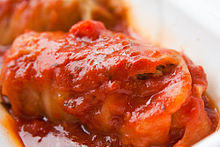 Nancy Krcek Allen, who wrote a cooking textbook, stated that the origins are unclear and that it is possible multiple groups of people invented it at the same time.[1] A version called holishkes is traditionally eaten by Jews on Simchat Torah; stuffed cabbage is described by Gil Marks to have entered Jewish cooking some 2,000 years ago.[2] Recipes vary depending on region; Romanians and northern Poles prefer a savory sauce, while Galicia and Ukraine favor sweet-and-sour, for example.[2]
