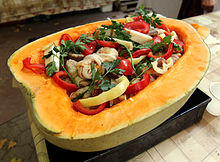In Egyptian cuisine, cabbage rolls are called محشي كرمب, pronounced maḥshī kromb or maḥshī koronb (as Standard Arabic [m] often turns to [n] in proximity to [b] in Egyptian Arabic), literally translating to "stuffed cabbage". The leaves are fresh and commonly cut into smaller pieces and partially pre-cooked. The most common filling is a mixture of rice, onion, tomato, herbs, and spices (most typically including mint, dill, and cumin); meat is rarely used in Egyptian stuffed cabbage. The rolls are arranged in a pot and boiled in broth or tomato-based sauce, also including the herbs and spices.[19] As the pieces of cabbage and therefore the rolls are small, the leaves are usually simply rolled around the filling almost like a small cigar, and are left open at the ends rather than folded around the filling to produce a completely enclosed package.[19]