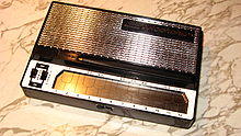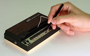 The Stylophone is a miniature analog stylus-operated keyboard. Invented in 1967 by Brian Jarvis,[1] it entered production in 1968, manufactured by Dubreq. It consists of a metal keyboard made of printed circuit board and played by touching it with a stylus—each note being connected to a voltage-controlled oscillator via a different-value resistor—thus closing a circuit. The only other controls were a power switch and a vibrato control on the front panel beside the keyboard, and a tuning potentiometer on the rear. Some three million Stylophones were sold, mostly as children's toys, but were occasionally used by professional musicians such as Rolf Harris and David Bowie.