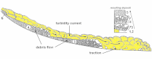 Subaqueous fan deposits are generally described as coarse to fine gravel and/or sand, with variable texture and sorting. Underflows (meltwater denser than lake water) tends to produce subaqueous fans with channels and levees.[3] Subaqueous fans can be formed by the influence of glacier movement and by underwater currents typically found at a river delta. The sediment size and composition that makes up the subaqueous fan is dependent on the type of rock that the water flow or glacial ice sheet moves over. Sedimentary structures found in subaqueous fans are heavily dependent on the strength of the water flow.[4]