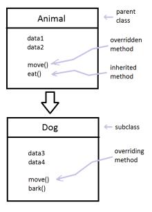 In object-oriented programming, inheritance is the mechanism of basing an object or class upon another object (prototype-based inheritance) or class (class-based inheritance), retaining similar implementation. Also defined as deriving new classes (sub classes) from existing ones such as super class or base class and then forming them into a hierarchy of classes. In most class-based object-oriented languages, an object created through inheritance, a "child object", acquires all the properties and behaviors of the "parent object" , with the exception of: constructors, destructor, overloaded operators and friend functions of the base class. Inheritance allows programmers to create classes that are built upon existing classes,[1] to specify a new implementation while maintaining the same behaviors (realizing an interface), to reuse code and to independently extend original software via public classes and interfaces. The relationships of objects or classes through inheritance give rise to a directed graph.