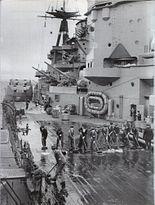 Sailors scrubbing the deck floor of the battleship HMS Rodney
