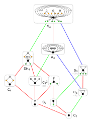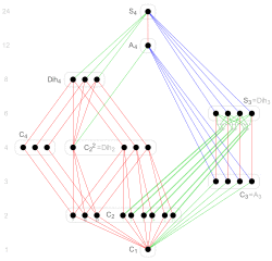 The symmetric group S4 showing all permutations of 4 elements ![]() | Hasse diagrams of the lattice of subgroups of S4 |