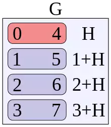 This group has two nontrivial subgroups: J={0,4} and H={0,2,4,6}, where J is also a subgroup of H. The Cayley table for H is the top-left quadrant of the Cayley table for G. The group G is cyclic, and so are its subgroups. In general, subgroups of cyclic groups are also cyclic.
