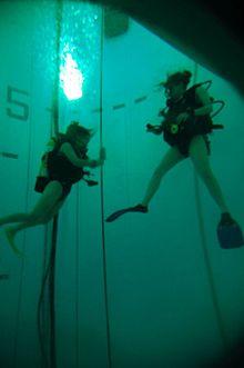 The tower was also privately hired to civilian diving clubs for the purpose of recreational diving and dive training. It was a popular 'novelty' dive amongst UK SCUBA divers since it allowed new trainees to extend their depth experience in a safe, controlled environment with good visibility and warm water temperature – two conditions that are in short supply in the UK. For similar reasons it was also used for freediving training, with participants including world record-holder Tanya Streeter.[8] In addition, the SETT has been used frequently for both underwater equipment testing, and to support media activity – notably hosting Blue Peter on a number of occasions, with some presenters completing ascent training. It has also been used frequently as a Situation Assessment Trials Tank (SATT) for Technical Divers.