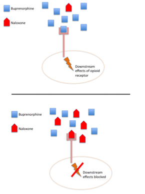 Buprenorphine, at lower doses, results in the usual opioid effects; however, high doses beyond a certain level do not result in greater effects.[6] This is believed to result in a lower risk of overdose than some other opioids.[6] Naloxone is an opioid antagonist that competes with and blocks the effect of other opioids (including buprenorphine) if given by injection.[2] Naloxone is poorly absorbed when taken by mouth and it is added to decrease the risk that people will misuse the medication by injection.[1] Misuse by injection or use in the nose, however, still occurs.[2] Rates of misuse in the United States appear to be lower than with other opioids.[7]