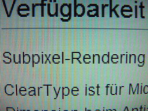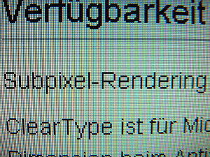 The composite photographs below show three methods of fonts rendering for comparison. From top: Monochrome; Traditional (whole pixel) spatial anti-aliasing; Subpixel rendering.