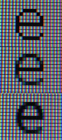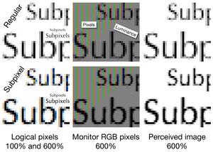 - Composite macro photograph of three types of rendering: monochrome, traditional antialiasing, subpixel rendering (from top to bottom)