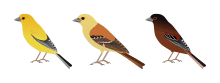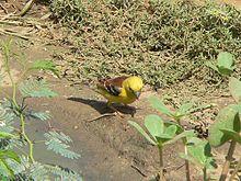 The Sudan golden sparrow is a smaller sparrow, at 12–13 cm (4.5–5 in) in length, with a wingspan of 5.7–7 cm (2.2–2.8 in). Males are distinctive in their bright yellow head and underparts, deep chestnut brown wings and back, and two white wingbars. In the breeding season the male's plumage is brighter still, and the bill changes colour from horn to shiny black. Females are pale sandy-buff with yellowish face, light brown wings, a back faintly streaked with chestnut, and pale yellow fading to whitish on the underparts. Juveniles are similar to females, but greyer.[9] About 10 weeks after hatching young males may start to get a yellow wash around the shoulder area. Its basic call is a chirp or tchirrup, similar to that of other sparrows. Variations include a song-like call, and a rapid rhythmic che-che-che.[9][10]