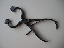 Households bought their white sugar in tall, conical loaves, from which pieces were broken off with special iron sugar-cutters (sugar nips). Shaped something like very large heavy pliers with sharp blades attached to the cutting sides, these cutters had to be strong and tough, because the loaves were large, about 14 inches (36 cm) in diameter at the base, and 3 feet (0.91 m) [15th century]...In those days, sugar was used with great care, and one loaf lasted a long time. The weight would probably have been about 30 pounds (14 kg). Later, the weight of a loaf varied from 5 to 35 pounds (2.3 to 15.9 kg), according to the moulds used by any one refinery. A common size was 14 pounds (6.4 kg), but the finest sugar from Madeira came in small loaves of only 3 to 4 pounds (1.4 to 1.8 kg) in weight...Up till late Victorian times household sugar remained very little changed and sugar loaves were still common and continued so until well into the twentieth century...