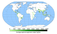 Worldwide, 26 million hectares were devoted to sugarcane cultivation in 2018.[51] The average worldwide yield of sugarcane crops in 2018 was 73 tonnes per hectare, led by Peru with 121 tonnes per hectare.[51] The theoretical possible yield for sugarcane is about 280 tonnes per hectare per year, and small experimental plots in Brazil have demonstrated yields of 236–280 tonnes of cane per hectare.[52][53]