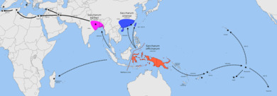 From Island Southeast Asia, S. officinarum was spread eastward into Polynesia and Micronesia by Austronesian voyagers as a canoe plant by around 3,500 BP. It was also spread westward and northward by around 3,000 BP to China and India by Austronesian traders, where it further hybridized with Saccharum sinense and Saccharum barberi. From there it spread further into western Eurasia and the Mediterranean.[12][13]