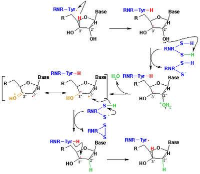 Free radicals derived from mercaptans, called thiyl radicals, are commonly invoked to explain reactions in organic chemistry and biochemistry. They have the formula RS• where R is an organic substituent such as alkyl or aryl.[4] They arise from or can be generated by a number of routes, but the principal method is H-atom abstraction from thiols. Another method involves homolysis of organic disulfides.[33] In biology thiyl radicals are responsible for the formation of the deoxyribonucleic acids, building blocks for DNA. This conversion is catalysed by ribonucleotide reductase (see figure).[34] Thiyl intermediates also are produced by the oxidation of glutathione, an antioxidant in biology. Thiyl radicals (sulfur-centred) can transform to carbon-centred radicals via hydrogen atom exchange equilibria. The formation of carbon-centred radicals could lead to protein damage via the formation of C−C bonds or backbone fragmentation.[35]