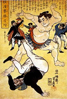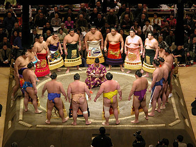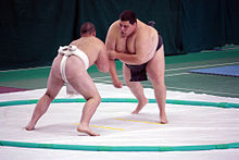 A sumo match (tori-kumi) between yokozuna Asashōryū (left) and then-komusubi Kotoshōgiku in January 2008. | |