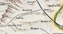 The railway was incorporated in 1890 by David Eccles.[4] The 3 ft (914 mm) narrow gauge railway's purpose was to haul logs to the Oregon Lumber Company sawmill in South Baker City. The sawmill and railroad remained separate corporations of the same owners for the life of the railroad.[5] The builders of the railway also owned the Grande Ronde Lumber Company in Perry, Oregon, and the railway was financed by Mormons in Utah.[6] The line was built over terrain originally considered as part of a railway from Denver, Colorado to the Pacific coast; but the Union Pacific Railroad opted for a different route to avoid bypassing growing communities which might provide an attractive opportunity for competition by the rapidly growing Oregon Railroad and Navigation Company.[5]