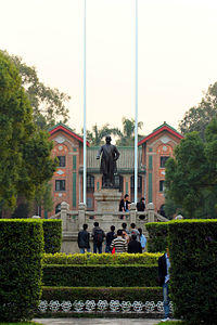 In 1924, Sun Yat-sen founded the National Canton University (國立廣東大學) and inscribed in his own handwriting the school motto of "Study Extensively, Enquire Accurately, Reflect Carefully, Discriminate Clearly, Practise Earnestly."[1][2] After the death of Sun Yat-sen, the national government that was set up during the first cooperation between the Communists and Nationalists formally decreed to change its name to Sun Yat-sen University on July 17, 1926, in memory of Sun Yat-sen. In 1926, there were five National Sun Yat-sen (Zhongshan) Universities: National First Sun Yat-sen (Zhongshan) University in Guangzhou (the current Sun Yat-sen University), National Second Sun Yat-sen (Zhongshan) University in Wuhan (the current Wuhan University), National Third Sun Yat-sen (Zhongshan) University in Zhejiang (the current Zhejiang University), National Fourth Sun Yat-sen (Zhongshan) University in Nanjing (the current Nanjing University, National Fifth Sun Yat-sen (Zhongshan) University in Zhengzhou (the current Henan University). In the 1930s, there were seven schools in the university: the Schools of Arts, Sciences, Law, Engineering, Agricultural Studies, Medicine and Education. In 1935, Tsinghua University, Peking University and Sun Yat-sen University set up the first graduate schools in China and began to enroll graduate students. In the 1950s, colleges, schools and departments were readjusted nationwide, and Sun Yat-sen University became a national top-tier comprehensive university with the liberal arts and sciences as its backbone disciplines.