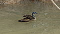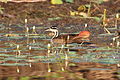 The female is a small, slim bird, averaging about 30 cm (12 in) in length. Sungrebes have lobed toes, and the bare skin of their feet and legs are boldly banded in yellow and black. The body plumage is mostly varying shades of reddish brown, while the head and neck are strikingly patterned with a black crown and nape and white stripes along the sides of its neck, as well as a white throat and chin. The long tail (almost a third of the total length) extends well beyond the body in flight, and sits fanned out on or just below the surface of the water while the bird swims. Females have a rufous patch on the side of the face that brightens to a cinnamon-orange color during the breeding season. Also during the breeding season, her eye ring becomes brighter in color and her lower mandible goes from dark red to bright scarlet. Slightly shorter on average than the male, with a slightly shorter wingspan, 13.77 cm (5.42 in), but slightly more powerfully-built with a higher average mass, 130–140 g (4.6–4.9 oz).[2][5][19]