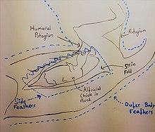 The pouch of a male sungrebe is a shallow, ovular pocket formed by pleats of well-muscled skin that extend along the side of the chest under the wings, further buffered by a wall of long, curved feathers growing upwards and backwards from the lower part of the side of the chest. These feathers hold chicks in place during movement, even allowing a male to carry them while diving and flying. The bird appears to have some muscular control over the shape of the pleats, and can restrict or enhance fluid flow into the tissue to make them more or less rigid. Each pouch can hold one or two chicks.[25][26][27]