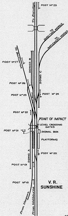The Ballarat and Bendigo lines were both controlled by absolute block signalling from the Sunshine signalbox. At Sydenham, the preceding signalbox on the Bendigo line, Milburn was given a "line clear" signal, because the Sunshine signaller had indicated the line was clear up to and through the station.[11][12] The distant signal, 970 yards from the point of impact, and the home signal, 283 yards from the point of impact, were set at danger.[13][note 1]