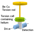 One can measure the superfluid response of the film by measuring the moment of inertia. An indispensable tool for this is the Torsional Oscillator, and early design was first used by Andronikashvili to detect superfluid in bulk fluid 4He and later modified by John Reppy and co-workers at Cornell in the 1970s. In the torsional oscillator, the experimental volume is suspended by a torsion rod and made to oscillate at resonance via capacitive coupling with a fin or pair of fins, depending on the configuration (shown below in grey). When part of the film becomes superfluid, it no longer has any viscosity and will remain at rest in the lab frame, lowering the moment of inertia of the cell. Recall that the resonant period of a torsional oscillator is . Therefore, lowering the moment of inertia reduces the resonant period of the oscillator. By measuring the period drop as a function of temperature, and total loading of the film from the empty cell value, one can deduce the fraction of the film that has entered the superfluid state. A typical set of data clearly showing the superfluid decoupling in helium films is shown in ref. 2.