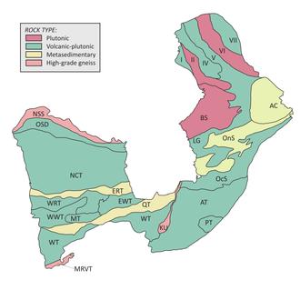 Winnipeg River Terrane (WRT) | - Gneiss and foliated tonalite[27][28][29] - Granite[28] | - Tonalitic plutonism followed by granitic plutonism[4] | - Iron deposits[4][30] | |