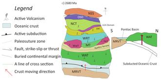 Before 2720 Ma, there were many pieces of microcontinent fragments which E-W trending conduit-like ocean crusts (with unknown extent) separates them.[70] During 2720 Ma, active subduction along the Northern Superior Superterrane and the North Caribou Terrane caused the southward drifting of the Northern Superior Superterrane. Over time, it united the North Caribou Superterrane and confined the Oxford-Stull domain, which contains rock assemblages related to the continental margin and oceanic crust.[70][71] The combination of the Northern Superior Superterrane and the North Caribou Superterrane by subduction marked the initiation of the Superior Craton formation. The southward movement of the Northern Superior Superterrane to the North Caribou Superterrane driven by subduction activity is evident by a) arc-related magmatism in Oxford-Stull domain during 2775-2733 Ma;[71] b) the south-over-north shearing zone at the contact between the two terranes.[72] The suture zone of the subduction is inferred to be the margin of the North Kenyon Fault.[71] The docking of the Northern Superior Superterrane is evident by the >3.5 Ga detrital zircons found in synorogenic (meaning that it forms during an orogenic event) sedimentary rocks aged <2.711 Ga.[71] The docking also initiated the eruption of shoshonitic volcanic rocks during 2710 Ma and the regional shortening. The regional shortening had undergone folding and foliation to form right-lateral, NW-trending shear zones.[70][71]