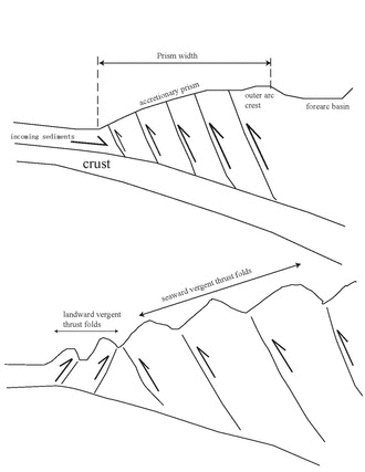Some terranes, such as the Quetico Terrane, were forearcs in the past. A forearc is the region between the volcanic arc and the subduction zone. It includes several components, including the subduction trench, the outer arc high of the oceanic crust, the accretionary wedges, and the sedimentary basin. The outer arc high is formed by the flexural upward motion of the oceanic crust edge before it enters the subduction zone. The accretionary wedges are formed from the accumulation of marine sediment scraped off from the oceanic crust before it is subducted. The sedimentary basin is formed from the accumulation of erosive material from the volcanoes, which lying flatly between the volcanoes and the topographic high of the accretionary wedge.[11]