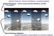A superpressure balloon (SPB) is a style of aerostatic balloon where the volume of the balloon is kept relatively constant in the face of changes in ambient pressure outside the balloon, and the temperature of the contained lifting gas. This allows the balloon to keep a stable altitude for long periods. This is in contrast with much more common variable-volume balloons, which are either only partially filled with lifting gas, or made with more elastic materials. Also referred to as pumpkin or Ultra Long Distance Balloons (ULDB) balloons, the sealed balloon envelopes have a pumpkin shape at flight altitude. [1] In a variable-volume balloon, the volume of the lifting gas changes due to heating and cooling in the diurnal cycle. The cycle is magnified by a greenhouse effect inside the balloon, while the surrounding atmospheric gas is subject to a much more limited cyclical temperature change. As the lift gas heats and expands, the displacement of atmospheric gas increases, while the balloon weight remains constant. Its buoyancy increases, and this leads to a rise in altitude unless it is compensated by venting gas. Conversely, if the balloon cools and drops, it becomes necessary to release ballast. Since both ballast and gas are finite, there is a limit to how long a variable-volume balloon can compensate in order to stabilize its altitude. In contrast, a superpressure balloon will change altitude much less without compensation maneuvers.[2]