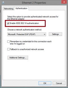 On a Windows machine, taking an example of Windows 8, one should make sure to enable one's client to act as a supplicant by going to the Network Properties of the Network Interface Card (NIC), and from the Authentication tab, "Enable IEEE 802.1X authentication" need to be checked. Similar steps need to be taken on other network devices that provide support for IEEE 802.1X authentication.[5] This is the most important single step a user will need to make in order for one's network device to act as a supplicant.