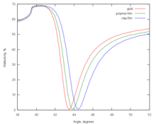 Surface plasmons have been used to enhance the surface sensitivity of several spectroscopic measurements including fluorescence, Raman scattering, and second-harmonic generation. However, in their simplest form, SPR reflectivity measurements can be used to detect molecular adsorption, such as polymers, DNA or proteins, etc. Technically, it is common to measure the angle of minimum reflection (angle of maximum absorption). This angle changes in the order of 0.1° during thin (about nm thickness) film adsorption. (See also the Examples.) In other cases the changes in the absorption wavelength is followed.[6] The mechanism of detection is based on that the adsorbing molecules cause changes in the local index of refraction, changing the resonance conditions of the surface plasmon waves. The same principle is exploited in the recently developed competitive platform based on loss-less dielectric multilayers (DBR), supporting surface electromagnetic waves with sharper resonances (Bloch surface waves).[7]