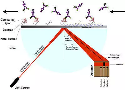 The actual SPR signal can be explained by the electromagnetic 'coupling' of the incident light with the surface plasmon of the gold layer. This plasmon can be influenced by the layer just a few nanometer across the gold–solution interface i.e. the bait protein and possibly the prey protein. Binding makes the reflection angle change;