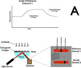 The first SPR immunoassay was proposed in 1983 by Liedberg, Nylander, and Lundström, then of the Linköping Institute of Technology (Sweden).[10] They adsorbed human IgG onto a 600-angstrom silver film, and used the assay to detect anti-human IgG in water solution. Unlike many other immunoassays, such as ELISA, an SPR immunoassay is label free in that a label molecule is not required for detection of the analyte.[11] Additionally, the measurements on SPR can be followed real-time allowing the monitoring of individual steps in sequential binding events particularly useful in the assessment of for instance sandwich complexes.