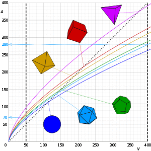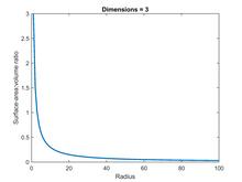 For an ordinary three-dimensional ball, the SA:V can be calculated using the standard equations for the surface and volume, which are, respectively, and . For the unit case in which r = 1 the SA:V is thus 3. The SA:V has an inverse relationship with the radius - if the radius is doubled the SA:V halves (see figure).