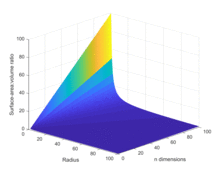 So the ratio reduces to . Thus, the same linear relationship between area and volume holds for any number of dimensions (see figure): doubling the radius always halves the ratio.