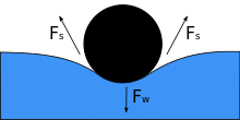 When an object is placed on a liquid, its weight Fw depresses the surface, and if surface tension and downward force becomes equal than is balanced by the surface tension forces on either side Fs, which are each parallel to the water's surface at the points where it contacts the object. Notice that small movement in the body may cause the object to sink. As the angle of contact decreases, surface tension decreases. The horizontal components of the two Fs arrows point in opposite directions, so they cancel each other, but the vertical components point in the same direction and therefore add up[3] to balance Fw. The object's surface must not be wettable for this to happen, and its weight must be low enough for the surface tension to support it.